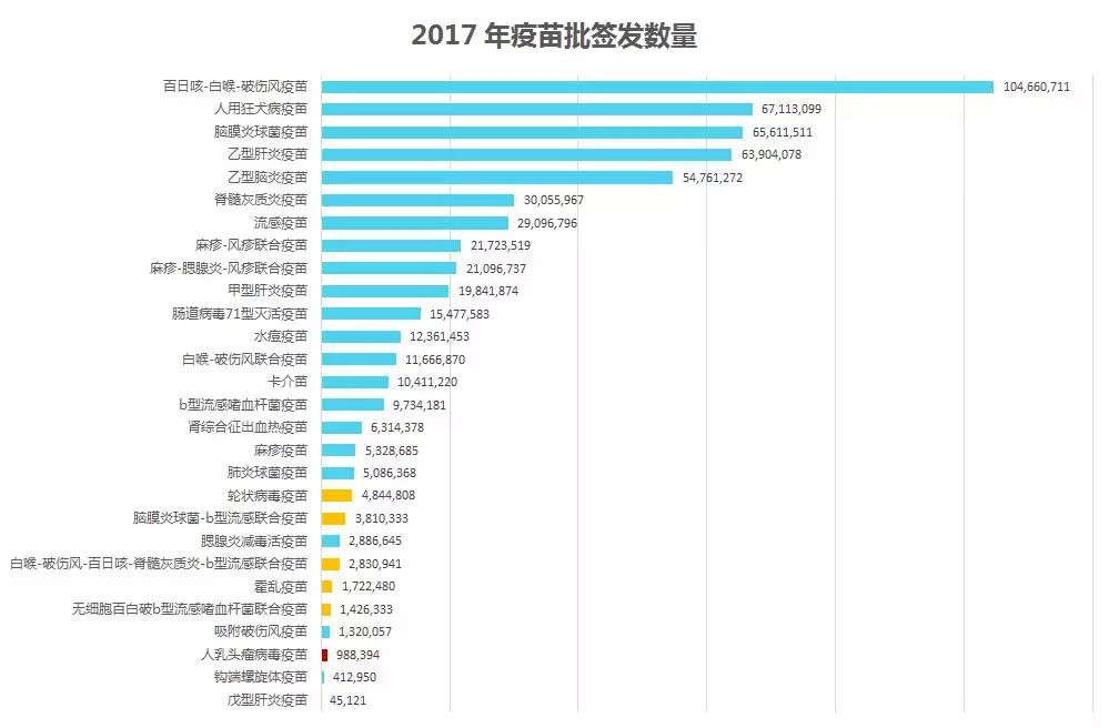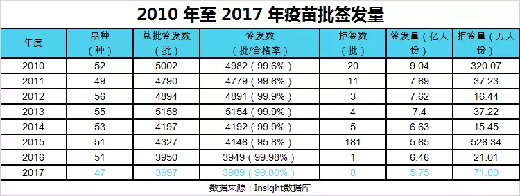 在中檢院和 7 家授權(quán)承擔(dān)生物制品批簽發(fā)的省級藥品檢驗(yàn)機(jī)構(gòu)(北京、上海、廣東、四川、湖北、甘肅和吉林)推進(jìn)下,2017 年,我國共簽發(fā)了 3997 批,共計(jì) 5.76 億份疫苗,涉及到 119 家企業(yè)的 47 個(gè)疫苗品種。