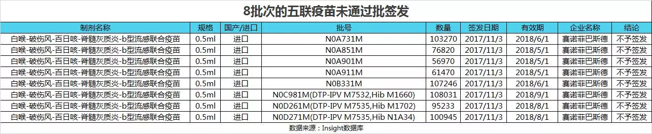 今年 11 月 3 號,8 批次的由賽諾菲巴斯德公司生產(chǎn)的第二類疫苗五聯(lián)疫苗(白喉-破傷風(fēng)-百日咳-脊髓灰質(zhì)炎-b 型流感聯(lián)合疫苗)未通過中檢所的批簽發(fā)檢驗(yàn),共計(jì) 709,985 的疫苗在發(fā)向市場的最后一步上被攔截,這直接導(dǎo)致了該疫苗供應(yīng)鏈的中斷,國內(nèi)多地出現(xiàn)五聯(lián)疫苗緊缺。