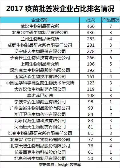 2017 年簽發(fā)總共涉及到 119 家企業(yè),今年,疫苗批簽發(fā)最多批次的企業(yè)是武漢生物制藥研究所,共簽發(fā)了 7 個(gè)品種,共計(jì) 466 個(gè)批次。