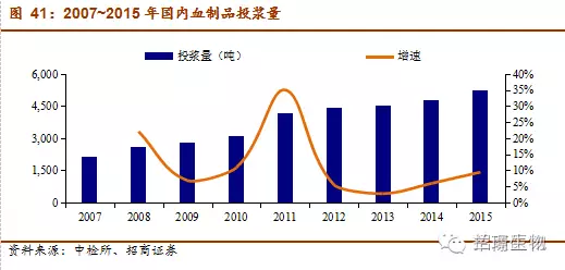 從漿量來(lái)看,國(guó)內(nèi)的需求量在10000噸以上,我們測(cè)算,2015年國(guó)內(nèi)采漿量~5800噸,投漿量約5200+噸同比增約10%,整體市場(chǎng)仍處于供不應(yīng)求的局面。