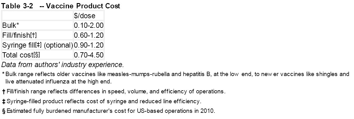 生產(chǎn)工廠造價(jià)非常昂貴,根據(jù)生產(chǎn)規(guī)模、生產(chǎn)復(fù)雜性和按照動(dòng)態(tài)藥品生產(chǎn)管理規(guī)范(current goodmanufacturing practices,cGMP) 要求用于清潔和工藝驗(yàn)證的大約20% 額外費(fèi)用,需要5 千萬(wàn)~3 億美元。除了少數(shù)例外,每種疫苗需要不同的生產(chǎn)廠房,這是因?yàn)楦饔胁煌纳a(chǎn)要求,不同產(chǎn)品的切換會(huì)造成管理上的困難。一些工藝過(guò)程是可放大的,像細(xì)菌或酵母發(fā)酵,因此擴(kuò)大生產(chǎn)設(shè)備( 也就是發(fā)酵罐)的尺寸會(huì)在很大程度上提高產(chǎn)量,隨著生產(chǎn)規(guī)模的擴(kuò)大單位成本也會(huì)降低。其他生產(chǎn)工藝( 如用雞胚和細(xì)胞培養(yǎng)生產(chǎn)病毒性疫苗)是不易放大的。為提高產(chǎn)量,就需要建造額外的工廠或者在現(xiàn)有工廠內(nèi)建造額外的生產(chǎn)模塊,因此隨著生產(chǎn)規(guī)模的擴(kuò)大單位成本不會(huì)明顯降低。盡管疫苗批量生產(chǎn)非常復(fù)雜,疫苗投產(chǎn)3~5 年后大多數(shù)批量疫苗的全部成本下降到每劑10 美分以下,而且產(chǎn)品成本主要與灌發(fā)、封裝和包裝有關(guān),對(duì)于生產(chǎn)廠家有限的成熟疫苗,能夠在整個(gè)產(chǎn)品周期保持很高的利潤(rùn)空間。