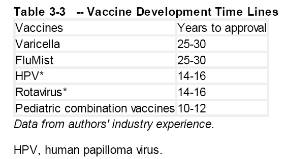 一個(gè)新藥或者新疫苗的研發(fā)預(yù)計(jì)花費(fèi)從1993年的2.31億美元上升至2003 年的8.02 億美元,到2010 年達(dá)到10 億美元。這些估算考慮到了所有的成本,包括產(chǎn)品研發(fā)失敗的費(fèi)用、獲批后臨床試驗(yàn)的費(fèi)用和改進(jìn)生產(chǎn)工藝的費(fèi)用。大約只有50%的費(fèi)用是有形的,其余的是資金成本。然而這些數(shù)字是有爭(zhēng)議的( 另有人估價(jià)為1億~2 億美元)。然而通過(guò)兩種途徑驗(yàn)證了較高的這一估價(jià)。第一,公司或業(yè)內(nèi)每年報(bào)批的新疫苗數(shù)量很少,與每個(gè)新產(chǎn)品研發(fā)費(fèi)用為6 億~8 億美元相關(guān)。如果一個(gè)公司每年花費(fèi)1億美元用來(lái)進(jìn)行疫苗研發(fā),那么預(yù)期每6~8年有一個(gè)新產(chǎn)品,這與事實(shí)基本相符。第二,生物技術(shù)公司專注于一個(gè)疫苗并將其成功投放市場(chǎng)花費(fèi)的研發(fā)費(fèi)用為5 億~7 億美元( Aviron/Medimmune)??偟膩?lái)說(shuō),疫苗研發(fā)從概念到獲批是一個(gè)漫長(zhǎng)的過(guò)程,可用今年來(lái)皮中的幾種疫苗的研發(fā)時(shí)間為例說(shuō)明。