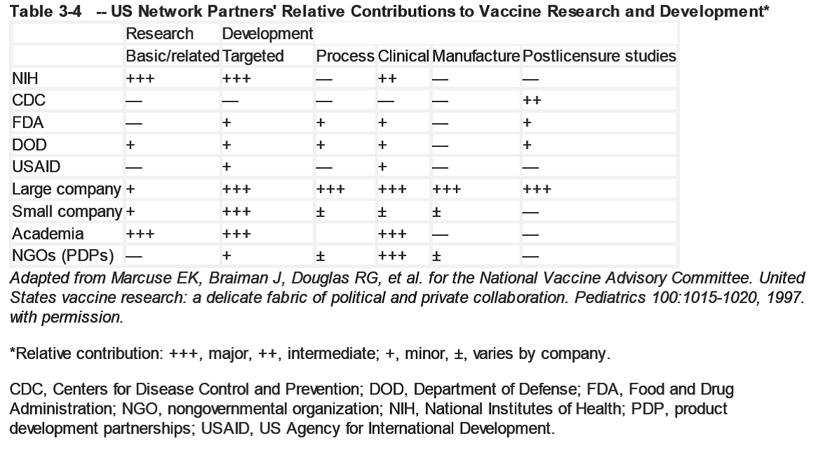 cine Initiative)、瘧疾疫苗行動(dòng)組織( Malaria Vaccineative)和Aeras(致力于開發(fā)結(jié)核病疫苗)等多個(gè)組織提供了大量資金,用于研發(fā)那些可能對(duì)發(fā)展中國(guó)家產(chǎn)生重大影響的疫苗。此外,PATH(Programs for Approprivate Technology in Health) 也是一個(gè)非營(yíng)利的相關(guān)組織,專門為發(fā)展中國(guó)家研發(fā)疫苗技術(shù)面打造私有組織之間的合作關(guān)系。這些產(chǎn)品研發(fā)合作伙伴組織( 實(shí)際上是非營(yíng)利性生物技術(shù)公司)不但為其生物技術(shù)和大型制藥合作伙伴帶來(lái)了專業(yè)知識(shí)、動(dòng)物模型、免疫檢測(cè)方法和疫苗試驗(yàn)基地,還提供了降低科技風(fēng)險(xiǎn)、機(jī)會(huì)成本和金融風(fēng)險(xiǎn)的早期資本投資。此外,他們還提供驗(yàn)證新型疫苗技術(shù)和平臺(tái)的機(jī)會(huì)。能夠提供全方位服務(wù)的大型疫苗公司的主要作用是疫苗研發(fā)。他們的基礎(chǔ)研究有限,但對(duì)特定生物的針對(duì)性研究較多,優(yōu)勢(shì)主要在臨床和工藝開發(fā)方面。工藝開發(fā)和化學(xué)工程的技術(shù)和人員主要在這些公司,而無(wú)其他來(lái)源。符合FDA標(biāo)準(zhǔn)的臨床試驗(yàn)幾乎全部由這些大公司完成,而這些項(xiàng)目的早期研發(fā)往往由學(xué)術(shù)界和合同研究組織(contract research organizations,CROs )完成。這些大公司還具備臨床研究、監(jiān)管事務(wù)、數(shù)據(jù)管理、統(tǒng)計(jì)、項(xiàng)目管理以及其他所需學(xué)科的技術(shù)和人員?;蛟S更重要的是,這些公司的管理是結(jié)構(gòu)化的,能夠迅速做出是否繼續(xù)研發(fā)的決定。這是降低風(fēng)險(xiǎn)和評(píng)估有效疫苗開發(fā)所必需的。