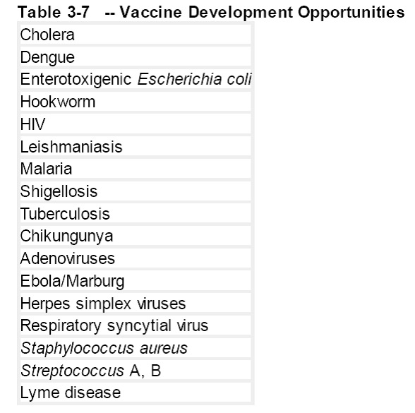 疫苗研發(fā)資金來源于政府、產(chǎn)品銷售收益風(fēng)險投資和慈善基金等。NIH 與其他聯(lián)邦機(jī)構(gòu)和項(xiàng)目競國家稅收資金的支持,通常情況下前者更容易獲資助。同樣,DOD、FDA.CDC 和USAID 贊助的疫苗研發(fā)項(xiàng)目也要與其他公共需求競爭資金,而且取決于政府的行政和立法部門。近來,針對生物恐怖疫苗( 炭疽和天花)和新發(fā)病原疫苗(埃博拉、西尼羅河病毒和流感大流行)的經(jīng)費(fèi)投入不但可能對疫苗研發(fā)和生產(chǎn)產(chǎn)生深遠(yuǎn)影響,而且可能促生疫苗行業(yè)新成員。