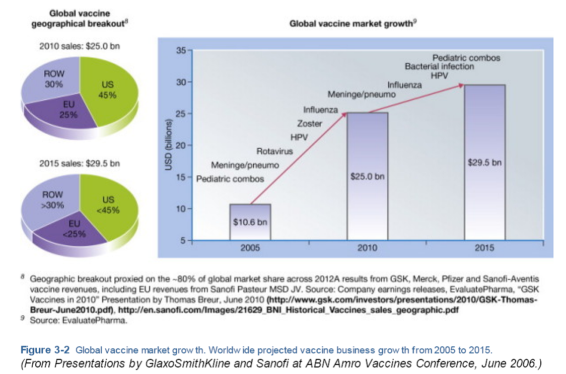 因此,這些公司內(nèi)部的預(yù)期是疫苗的銷售和成本比與其他醫(yī)藥產(chǎn)品相似,而收人則逐年遞增。雖然增加銷售量有時可以增加收人,但隨著疫苗產(chǎn)品成熟,價格趨于穩(wěn)定,收人也不再增長,因此需要不斷地推出新產(chǎn)品。然而與其他醫(yī)藥產(chǎn)品不同,在多種情況下老疫苗可以持續(xù)盈利: