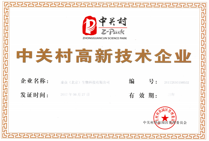 2017年6月27日,康眾(北京)生物科技有限公司榮獲中關(guān)村高新技術(shù)企業(yè)稱號(hào)。康眾生物主要致力于傳染病疫苗及惡性腫瘤抗體藥物研制。康眾生物憑借極強(qiáng)的研發(fā)能力,自主研發(fā)的創(chuàng)新工藝,持續(xù)進(jìn)行研究開發(fā),形成了企業(yè)核心自主知識(shí)產(chǎn)權(quán)和領(lǐng)先技術(shù)平臺(tái),被中關(guān)村科技園區(qū)管理委員會(huì)評審為“中關(guān)村高新技術(shù)企業(yè)”。此項(xiàng)資質(zhì)是對康眾生物的相關(guān)技術(shù)研發(fā)實(shí)力及企業(yè)健康可持續(xù)發(fā)展的高度認(rèn)可。